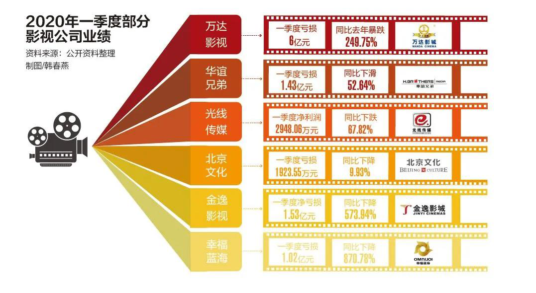 影院停業、電影撤檔的背后,上市影視公司業績一片慘淡。萬達電影一季度營收同比下跌70.12%,虧損近6億元,同比去年暴跌249.75%。中國電影一季度營收同比下降88.39%,虧損2.27億元,同比去年暴跌163.95%。此外,華誼兄弟、橫店影視、金逸影視等一季度均處于虧損狀態。